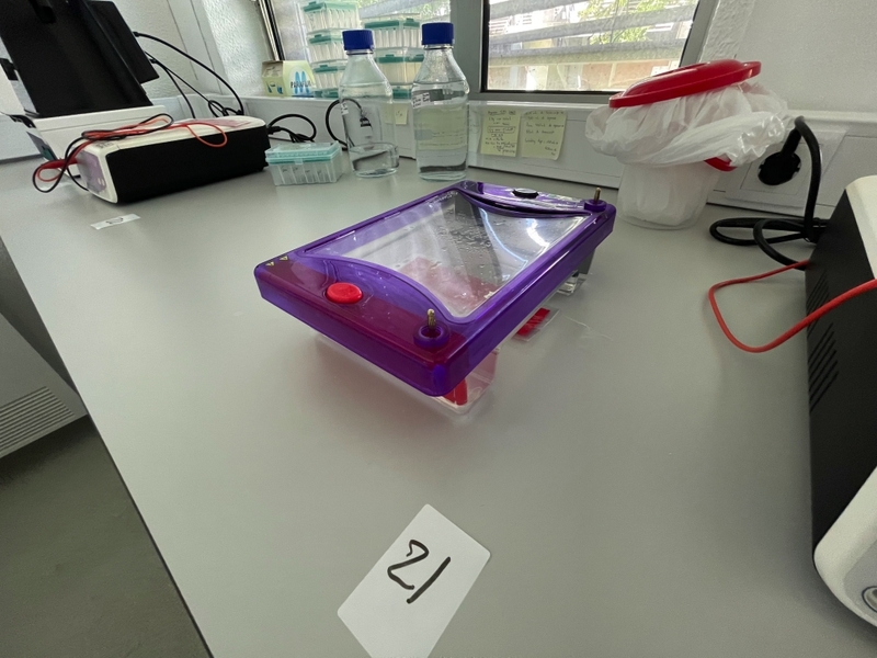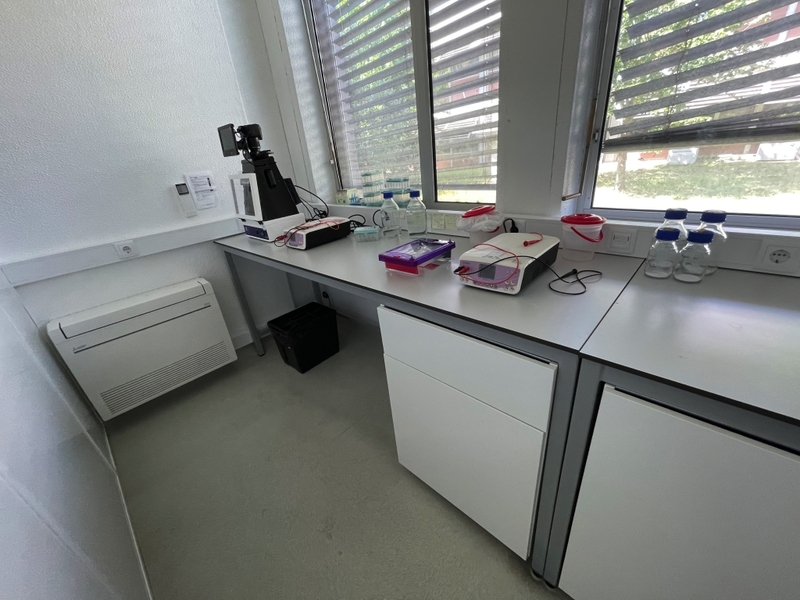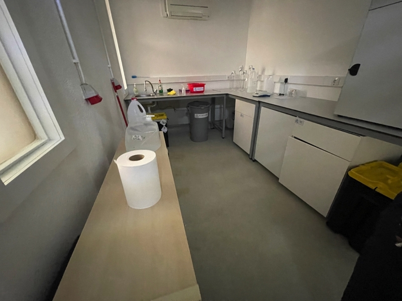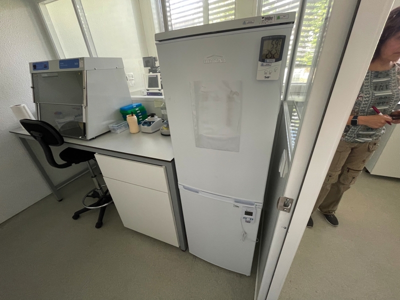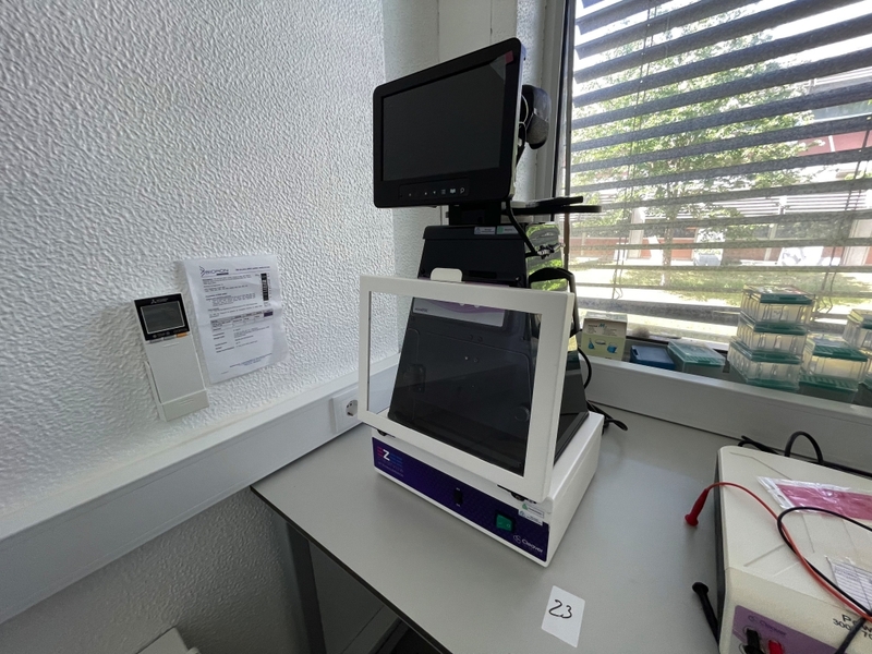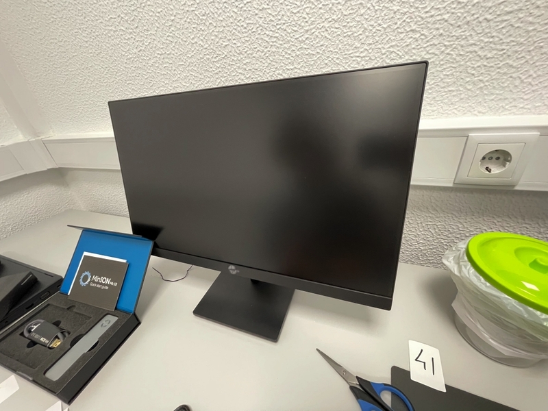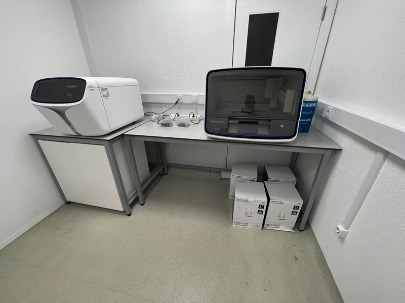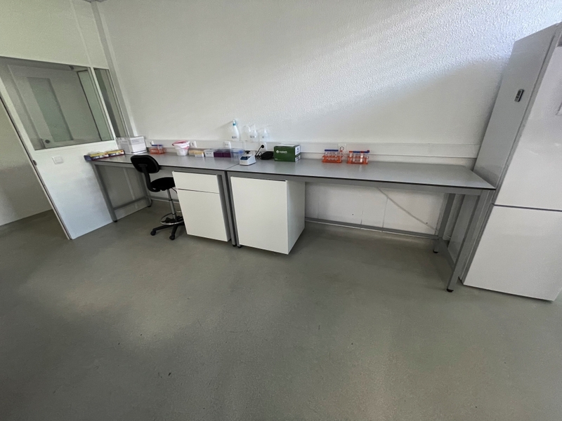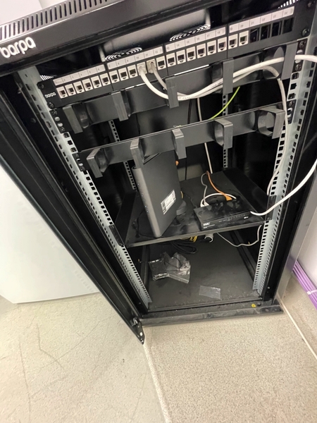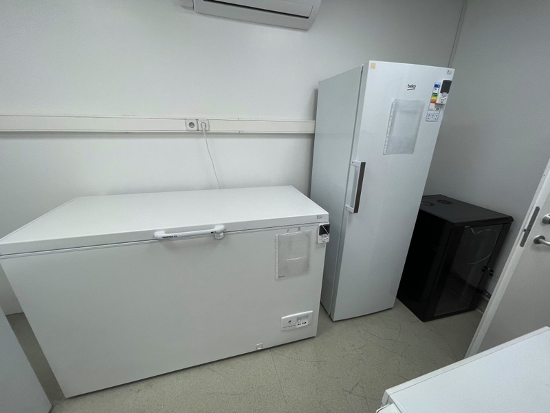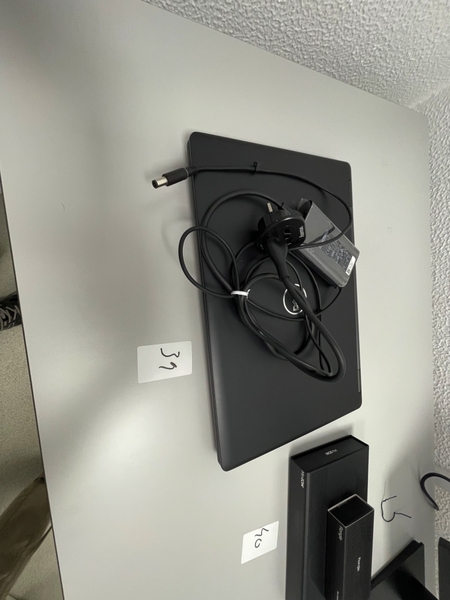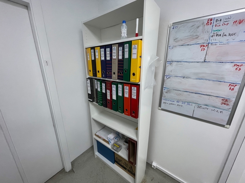 Duas secretárias em lacado de cor branca com gavetas, um cabide metálico, um movel de arquivo com um módulo e prateleiras, um quadro de parede, dois ares condicionados da marca Koysun, uma secretária em lacado de cor branca, dois computadores portáteis um da marca HP e outro da marca Lenovo